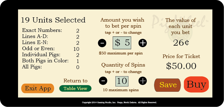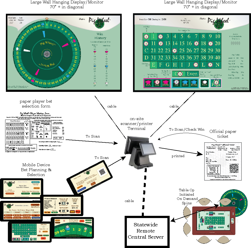 The Main Game Display is meant to be a large (70"+) flat panel television or display that hangs on the bar wall. It is from this display that the wheel will go through simulated rotating spins, slowing to eventually stop at the winning number or pig. All such displays in the state would spin at the same time and would show the same number or pig as a win. The display provides players with a clock count down to the next spin and 20 - 30 seconds prior to that next spin, the clock numbers will turn red to indicate that betting for the next spin is closed. The spin number is for reference on the ticket in knowing which events the ticket was valid for use. The "Win History" merely gives players an indication of what recently won so they can check their tickets or bet according to whatever they believe past wins tell them. If a pig is shown as a win, a brief animation will show whereby that winning pig shares a very short story or thought about themselves, the other pigs, those disturbed birds or something entirely else.
