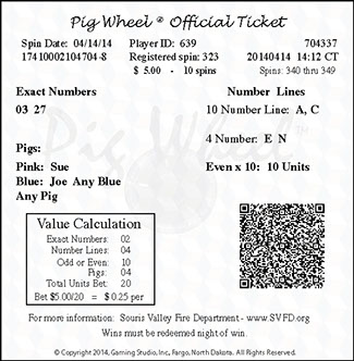 Once the player has marked their selections on the paper form, they provide the form and, in this case, $50 (10 consecutive spins at $5.00 each) to a clerk or bartender in Minnesota. The Form is scanned into the statewide central computer server and an official ticket is printed. It is likely that regulations would allow players to buy no more than ten consecutive spins.