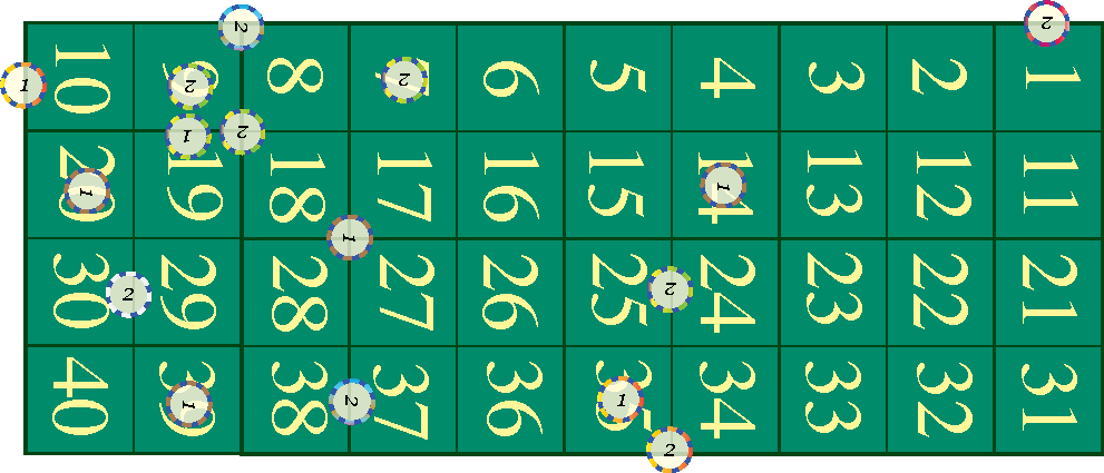 "2 Row" bet: Placing a chip on the line at the end of a row, means both rows are bet. This is a bet that numbers ending in 8 and 9 might win.