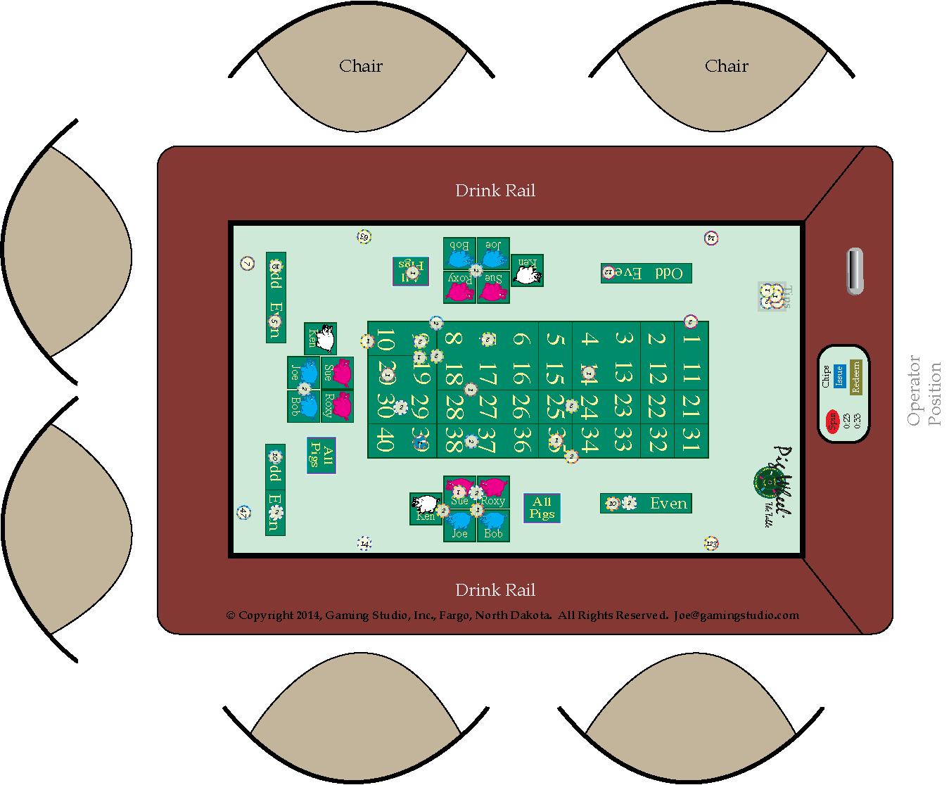 Designed for both states charitable gaming in that both are quite similar with paddle wheels that Gaming Studio's Richardson designed in the 80s and 90s. While both the very popular Pig Wheel® and Tri-Wheel® are operated in North Dakota, the Pig Wheel® is not operated in Minnesota because MN statute allows only numerals as segment identifiers and not symbols and or letters. We hope this is changed in the 2016 Minnesota session.